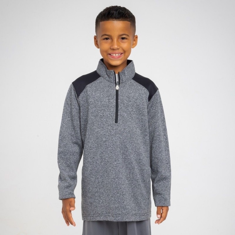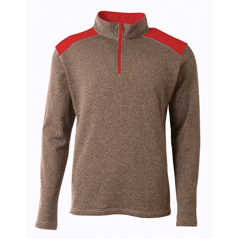 Heathered 6oz fleece and shoulder color blocking give this athletic quarter zip a unique look and feel. Also features contrast zipper and 2 pockets.