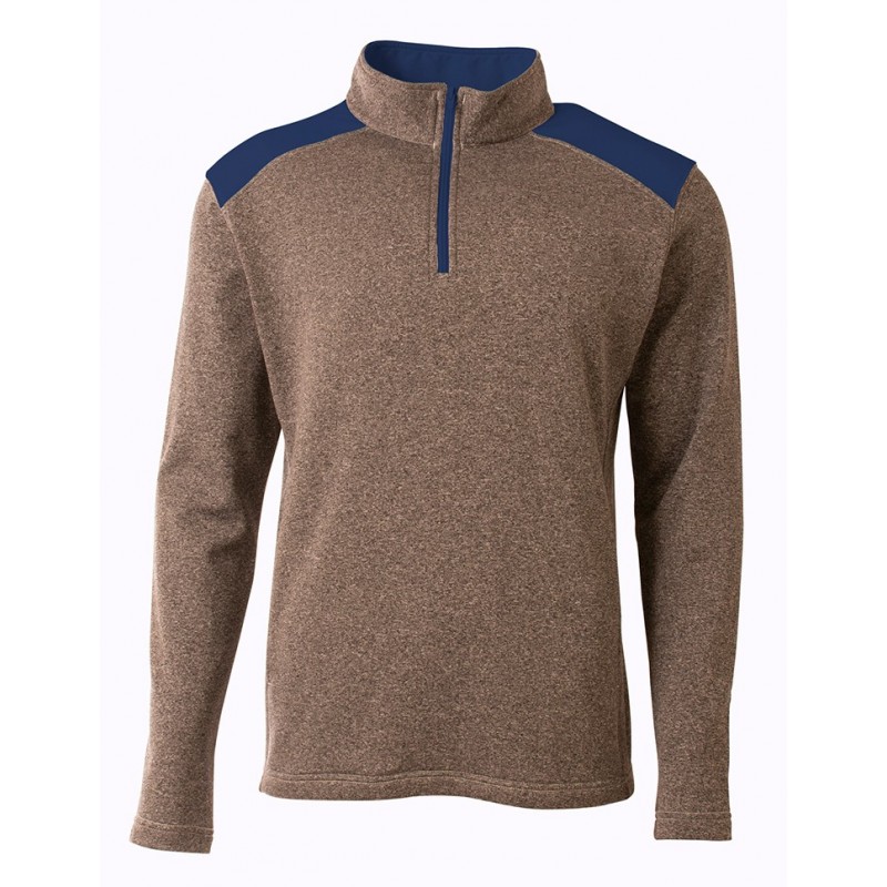 Heathered 6oz fleece and shoulder color blocking give this athletic quarter zip a unique look and feel. Also features contrast zipper and 2 pockets.
