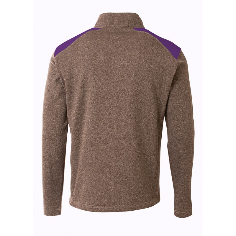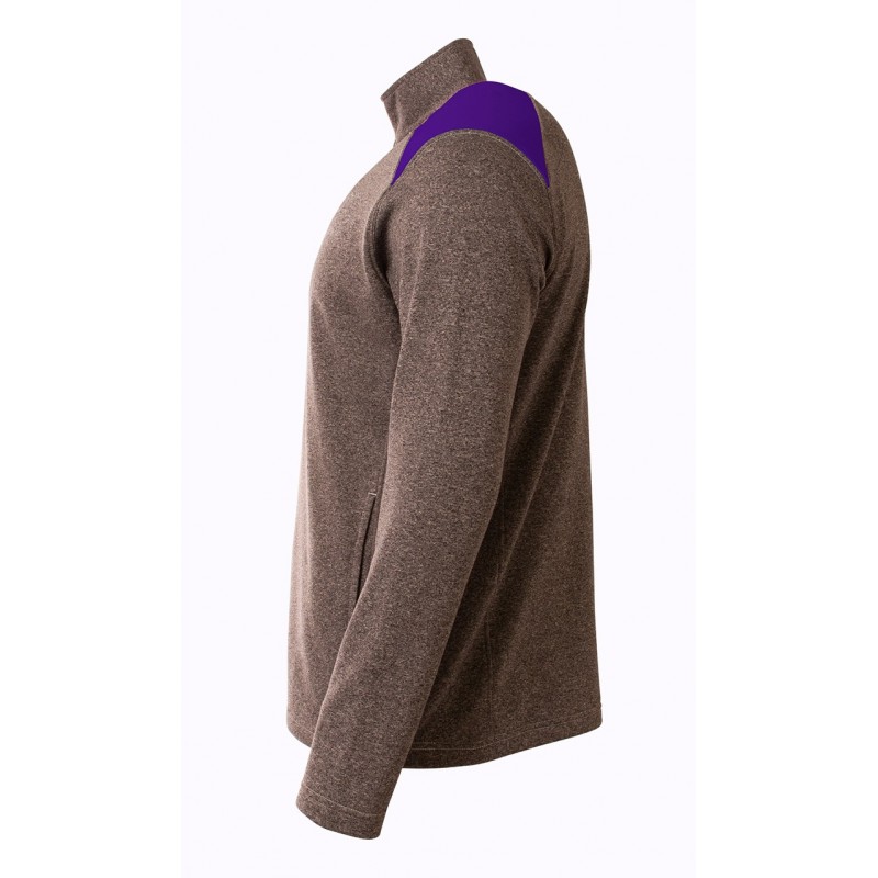 Heathered 6oz fleece and shoulder color blocking give this athletic quarter zip a unique look and feel. Also features contrast zipper and 2 pockets.